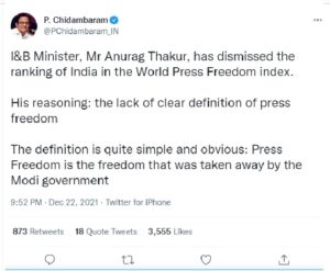 இதை விமர்சித்து தனது ட்விட்டர் பக்கத்தில் பதவிட்டுள்ள முன்னாள் மத்திய அமைச்சர் ப.சிதம்பரம், “தகவல் மற்றும் ஒளிபரப்பு அமைச்சர் அனுராக் தாக்கூர் உலக பத்திரிகைச் சுதந்திர குறியீட்டில் இந்தியாவின் தரவரிசையை நிராகரித்துள்ளார்.