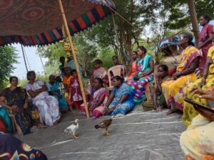 மக்களிடம் பேசிக் கொண்டிருந்த போது ஒரு பெண்ணின் கழுத்தில் தங்கத்துடன் கருப்பு மணி ஒன்றை காண முடிந்தது.
