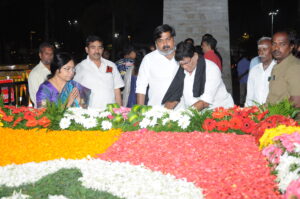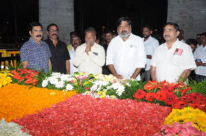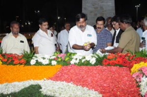 அதன் தொடர்ச்சியாக சென்னை காமராஜர் சாலையில் உள்ள எம்.ஜி.ஆர். நினைவிடத்தில் டாக்டர் எம்.ஜி.ஆர். ஜானகி மகளிர் கலை மற்றும் அறிவியல் கல்லூரியின் தாளாளர் முனைவர் லதா ராஜேந்திரன், டாக்டர் எம்.ஜி.ஆர். ஜானகி மகளிர் கலை மற்றும் அறிவியல் கல்லூரியின் தலைவர் வழக்கறிஞர், முனைவர் குமார் ராஜேந்திரன், அவரது தங்கை மருத்துவர் செல்வி ராஜேந்திரன், சென்னை தி.நகரில் உள்ள எம்.ஜி.ஆர். நினைவு இல்லப் பராமரிப்பாளர் சுவாமிநாதன் உள்ளிட்டோர் எம்.ஜி.ஆர். நினைவிடத்தில் மலர் வளையம் வைத்து மலர் தூவி அஞ்சலி செலுத்தினர்.