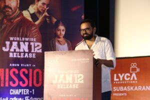 நடிகர் அருண்விஜய் பேசியதாவது, “பொங்கல் பண்டிகைக்கு வெளியாகும் என்னுடைய முதல் படம் ‘மிஷன் சாப்டர்1’ என்பது எனக்கு ரொம்ப சந்தோஷம். நாம் என்னதான் உழைப்பைக் கொடுத்திருந்தாலும் படம் சரியான தேதியில் வெளியாவது என்பது முக்கியமான விஷயம். அதை செய்து கொடுத்த லைகாவுக்கு நன்றி. நான் இதுவரை நடித்தப் படங்களிலேயே ‘மிஷன் சாப்டர்1’ தான் அதிக பொருட்ச்செலவில் உருவாக்கப்பட்ட படம். இந்த ஸ்கிரிப்ட் கொடுத்த விஜய்க்கு நன்றி. ஆக்ஷன், எமோஷன் என எல்லாமே இதில் சரியாக வந்திருக்கிறது. சிறந்த திரையரங்க அனுபவத்தை இந்தப் படம் கொடுக்கும். ஏமி ஜாக்சன், நிமிஷா எனப் பலரும் இதில் நடித்துள்ளனர். ஜிவி பிரகாஷின் இசை இந்தப் படத்திற்குப் பெரிய பலம். லண்டன், சென்னை ஆகிய இடங்களில் இதை படமாக்கினோம். நாலரை ஏக்கரில் மிகப்பெரிய ஜெயில் செட்டை இங்கு உருவாக்கினோம். சில காரணங்களால் அது சேதமானது. அப்போது கூட செலவைப் பற்றி பொருட்படுத்தாது லைகா புரொடக்ஷனஸ் எங்களுக்கு முழு ஆதரவு கொடுத்தார்கள். தொழில்நுட்பக்குழுவும் படத்திற்குப் பெரிய பலம். படப்பிடிப்புத் தளத்தில் கொஞ்சம் ரிலாக்ஸ் செய்யலாம் என்று நினைத்தேன். ஆனால், விஜய் அதற்கான நேரமே தரமால் திட்டமிட்டபடி சரியாக வேலை செய்து முடித்தார். ஒவ்வொரு நாளும் படப்பிடிப்பு தளத்தில் 1500 பேர் நிச்சயம் இருப்பார்கள். அவர்களை எல்லாம் விஜய் அழகாக மேனேஜ் செய்திருக்கிறார். என்னை வேறொரு கோணத்தில் இந்தப் படம் காட்டும். ஆக்ஷன், எமோஷன் என அனைத்து விஷயங்களிலும் புதிதாக முயற்சி செய்திருக்கிறோம். இப்படியான கதையைக் கொடுத்த மகாதேவன் சாருக்கு நன்றி. படக்குழுவினர் அனைவருக்கும் நன்றி. பொங்கல் அன்று உங்கள் அனைவரையும் சந்திக்கிறோம். எங்களுடன் வெளியாகும் அனைத்துப் படங்களும் வெற்றி பெற வேண்டும் என்பதுதான் என் விருப்பம்” என்றார்.